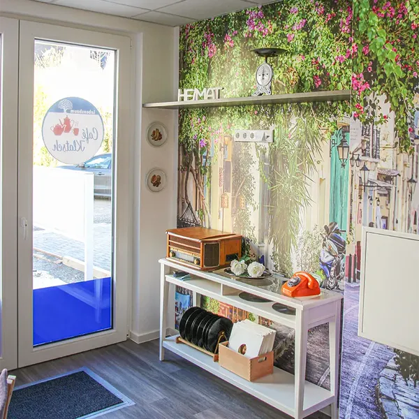 Das Café ist ganz im Retrostil eingerichtet. Gemütlich kann hier zusammen ein Kaffee getrunken, die Tageszeitung gelesen oder weitere milieuorientierte Angebote genutzt werden.