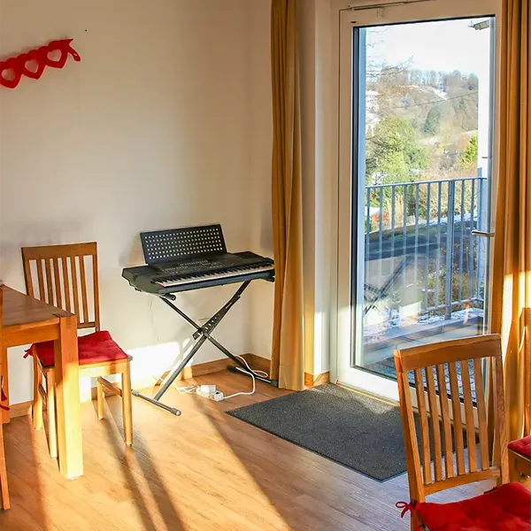 Unsere Räume sind freundlich gestaltet und bieten genügend Platz, um gemeinsam Zeit zu verbringen oder kurze Ruhepausen einzulegen. Besonders schön ist unser Balkon, der einen weiten Blick ins Tal ermöglicht und zu kleinen Auszeiten an der frischen Luft einlädt.
